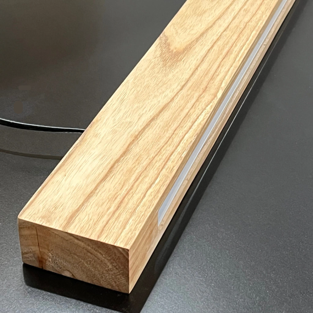 Su diseño lineal resalta las vetas naturales de la madera, creando un ambiente acogedor. Equipado con tecnología LED, proporcionando una luz suave y equilibrada. Perfecta para salones, comedores o dormitorios.